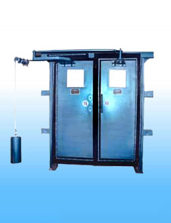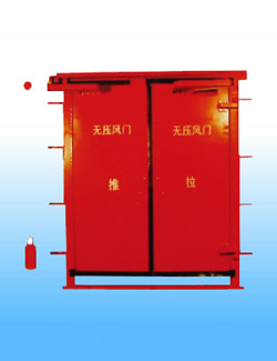 本手動(dòng)無(wú)壓風(fēng)門(mén)由門(mén)框、門(mén)扇、平衡機構及配重等部分組成。